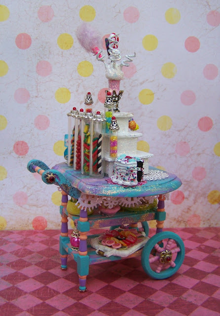 Still have to make the other pieces for the top twirly display. There will be a couple ice creams I think. A chocolate cone with bits of candy bar in it and a bright candied vanilla one with a cherry on top. As you can maybe see, I've made a cute little decorated chocolate cake with a slice taken out of it. There is also a glass pedestal candy cup holding various sugared suckers and lolly pops. There are shiny glass orbs inside the glass cup that are currently swimming in clear glue that has yet to dry out :) The glue will shrink up leaving only the orbs showing holding in the stems of the candy pops. I wish you all could see how lovely this really is in person! I'll post updates as I work along.