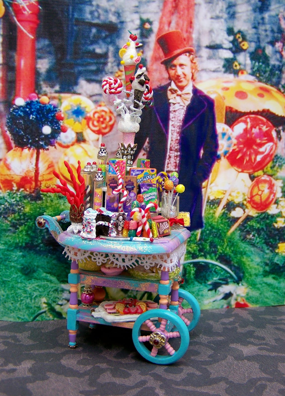I literally only have three more tiny things to make before the trolley is done. I don't have time today because my son has a thing we have to go to for school today. But I thought I could go ahead and post because it's nearly done and all I have to do basically is make the candy trees that go with it. They won't be large, not much bigger than the trolley itself. I'll start them tomorrow. For now, I can show you this until I have the set completed which won't be long now. I have to say this is my best piece to date, it's truly a labor of love and time. I have worked slowly and enjoyed it, taken my time and done well. It started really as a candyland theme but has evolved into a candyland/willy wonka and the chocolate factory trolley due to the lack of proper candy labels from anything candland related. But, I'm glad it happened that way :) It was really fun looking for wonka labels and finding my own "golden ticket" which now resides on the trolley next to the glass vase of lollies :) I love this piece, truly love it and I am so proud of it. My best work in my opinion to date :) Anywho, here it is: